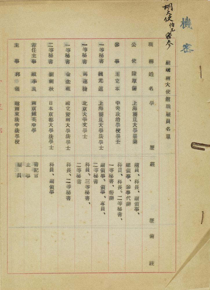 越南參考資料十一件附越南大使館職雇員名冊一件