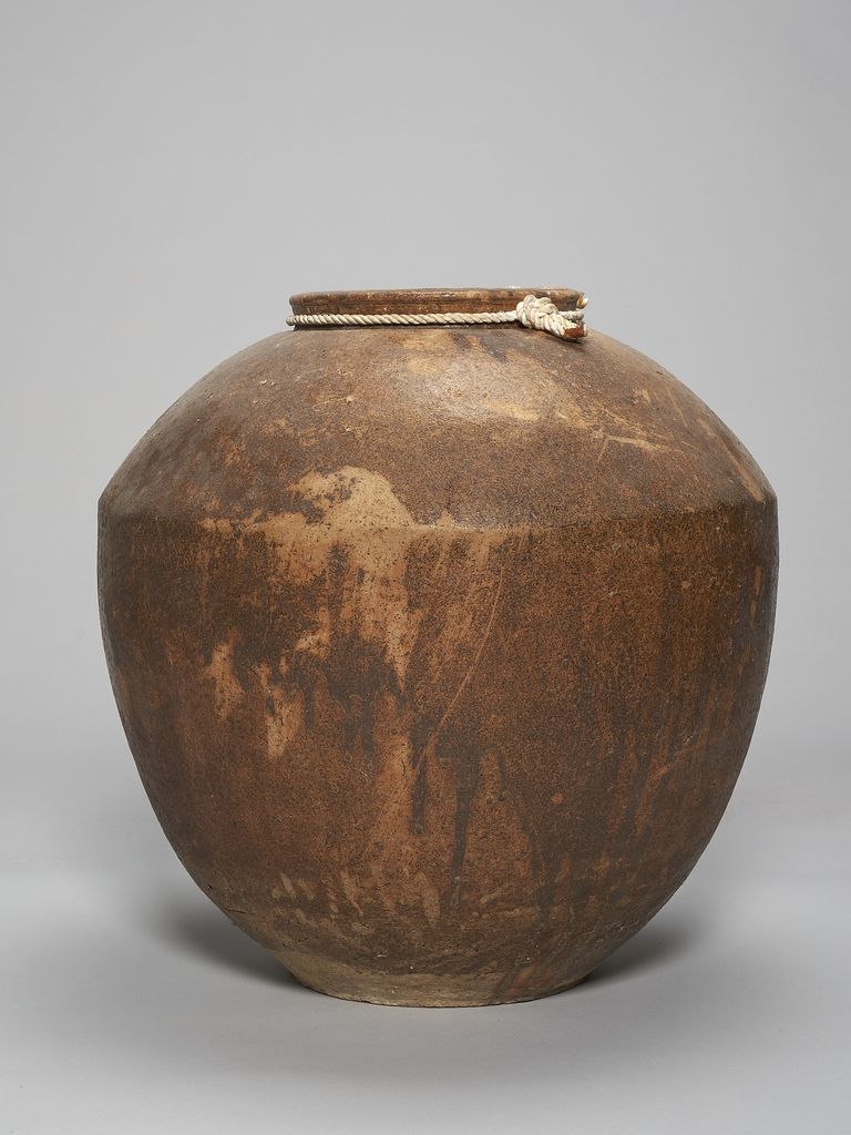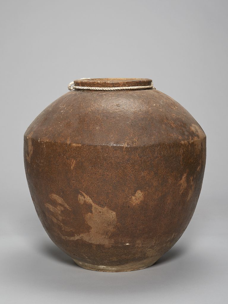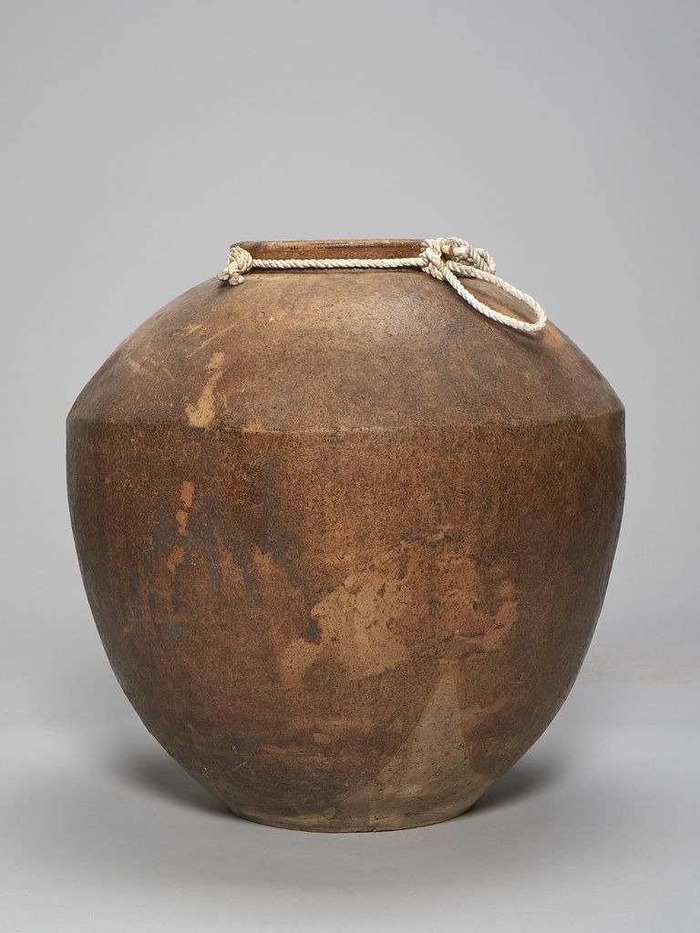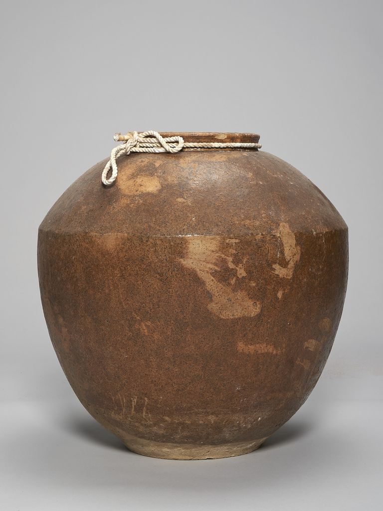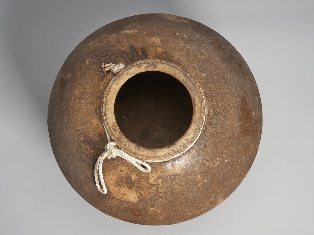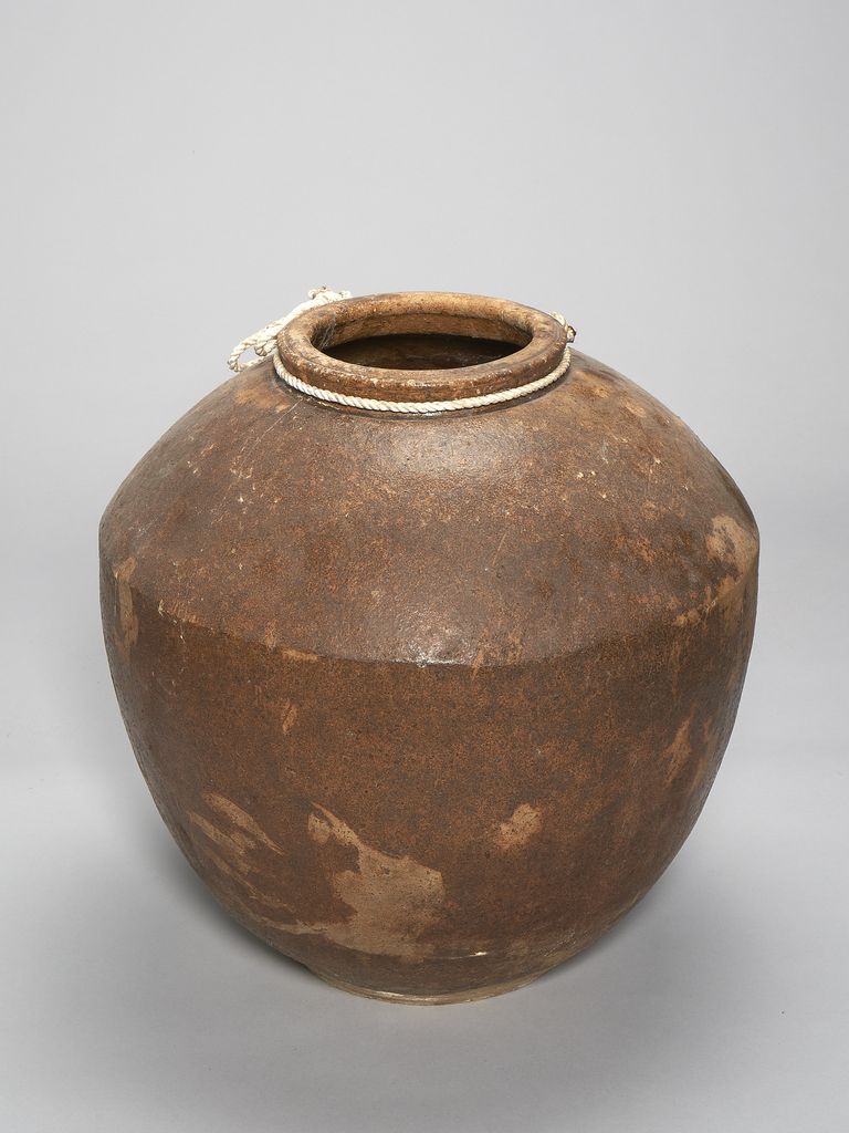 此為唇口、協肩腹部微收、平底無足陶缸,口緣處有束頸,缸腹有一折線收向口緣,缸面呈暗褐色,但色不均勻,有部分斑駁,靠底處則無釉色,成胎土色,表面無紋飾,粗糙,有部分破口處以及些許裂痕,口緣內側與缸內側無釉,頸處捆有一繩。