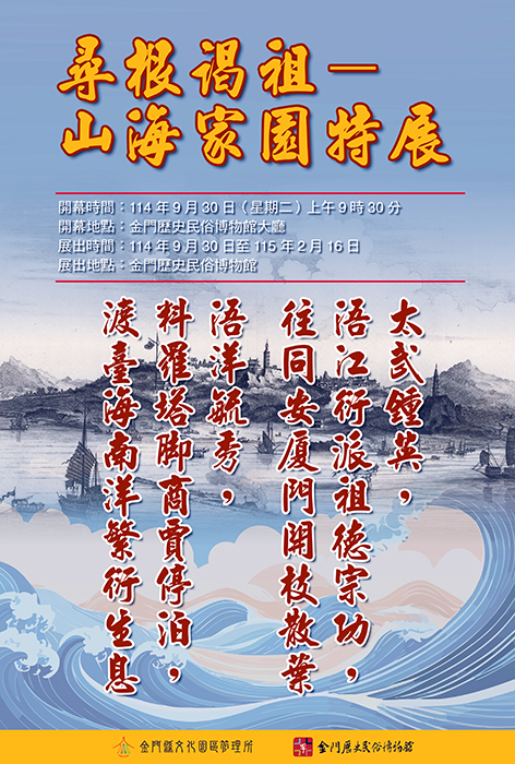 記者: 陳麗妤/綜合報導金門縣文化園區管理所,預計於(今)10月22日上午10時,假金門歷史民俗博物館,辦理「尋根謁祖-山海家園特展」暨「老祖宗的手藝-金門閩南民藝與民具展」等聯合展覽開幕儀式,當日下午1時起並舉辦兩場專題講座,歡迎各界及對活動有興趣之鄉親踴躍到場共襄盛舉,共同見證金門文化的新篇章。金門縣文化園區管理所所長盧根陣表示,策劃這兩場展覽意義深遠,源自於島嶼環境與常民文化一段從土地、生活與文化記憶中延伸出的時代對話。特別是金門在歷史長河中,融合戰地背景、僑鄉文化與閩南生活智慧,孕育出獨特的常民文化。其一「尋根謁祖-山海家園特展」,源自金門分衍古同安內地的家族聚落概況,以《浯江衍派》對接家廟遷徙進行的田野調查為基礎。二則,「老祖宗的手藝-金門閩南民藝與民具特展」,以金門閩南傳統工藝傳承製作為核心,透過器物看見背後的勞動產業與工藝美學精神,從生活中理解歷史與生活在勞動與智慧中演進。該活動於下午1時30分於文化園區博學館一樓教室,將舉辦兩場專題講座,包括:1時30分由黃振良主講〈浯江衍派:金門徙衍古同安內地的家族聚落〉,3時由李仕德主講〈從金門古地圖看金門歷史〉,邀請各界踴躍參與。文化園區管理所指出,「尋根謁祖-山海家園特展」,《山》則彰顯過往金門先民以浯江衍派自元、明、清時期分衍古同安內地的家族聚落歷程;《海》則並展出與金門及海上相關的中外古地圖五十幅,藉此探索金門在古代航海、海防與中外交流史中的角色。展覽副標題「太武鍾英,浯江衍派祖德宗功,往同安廈門開枝散葉;浯洋毓秀,料羅塔腳商賈停泊,渡臺海南洋繁衍生息」,呼應金門人跨海拓殖的歷史與精神傳承,分別藉由黃振良與李仕德兩位資深學者的調研成果協助下呈現。以金門宗族為主的《浯江衍派》,分衍古同安內地的家族聚落概況,由黃振良老師於2018年至2019年間進行的田野調查為基礎,廈門市所屬的同安區109個聚落,翔安區39個,集美區8個,海滄區2個,共計158個聚落,這158個聚落中,透過祖譜、家廟和宗祠碑志、營建志、門聯、柱聯和開基祖墓碑上文字,確定有133個聚落是分別來自金門的28個宗族聚落,由58個人徙居過海定居繁衍,再分衍為目前這133個家族聚落,為金門先輩分衍古同安家族聚落的第一手田野調查資料。「老祖宗的手藝-金門閩南民藝與民具特展」,則規劃以「民藝與民具」主軸,藉由鄉親陳堃樑等旅外鄉親所捐回之收藏文物呈現11大主題展區,包括蓑衣、農事、竹藝、木作、嫁娶、文具、粿印、刀鋸、工具、生活與娛樂,帶領觀眾看見金門技藝之美如何淬鍊出獨特的生活美學。展覽不僅展示工序與物件,更強調民藝作為文化記憶與生活脈絡的象徵。期透過全新的策展詮釋手法,讓傳統文化從靜態展示轉化為可理解、可感受、可連結的公共文化經驗,讓觀眾重新思考「文化」如何在當代生活中再生與延續。文化園區管理所也說明,金門縣政府近年積極推動文化與永續並進的發展策略,秉持「建構優質自然文化環境,邁向健康活力島嶼社會」的願景,從生活、生態、觀光到兩岸交流,持續塑造文化自信與地方認同。文化不只是保存資料或辦理活動,而是人民在地生活方式的展現。而文化的力量,是讓人知道自己從哪裡來、要往哪裡去。金門的風土、工藝、產業、美學與歷史記憶,都值得被重新理解與尊重。金門縣文化園區管理所未來將持續推動民間工藝調查與保存、地方館舍升級、文化創意轉譯、跨域展演合作以及國際交流鏈結,讓金門文化走得出去,也走得回來。金門縣文化園區管理所,也期許藉由「山海家園」與「民藝民具」聯合展,期讓觀眾從島嶼山海自然與工藝的藝術與民具演化、從手工藝到遷徙史,看見金門文化的深厚力量。這不僅是一場展覽,更是一場文化再生與時代對話的行動,邀請大家一同走進展場,感受金門文化的底蘊、創意與生命力。
